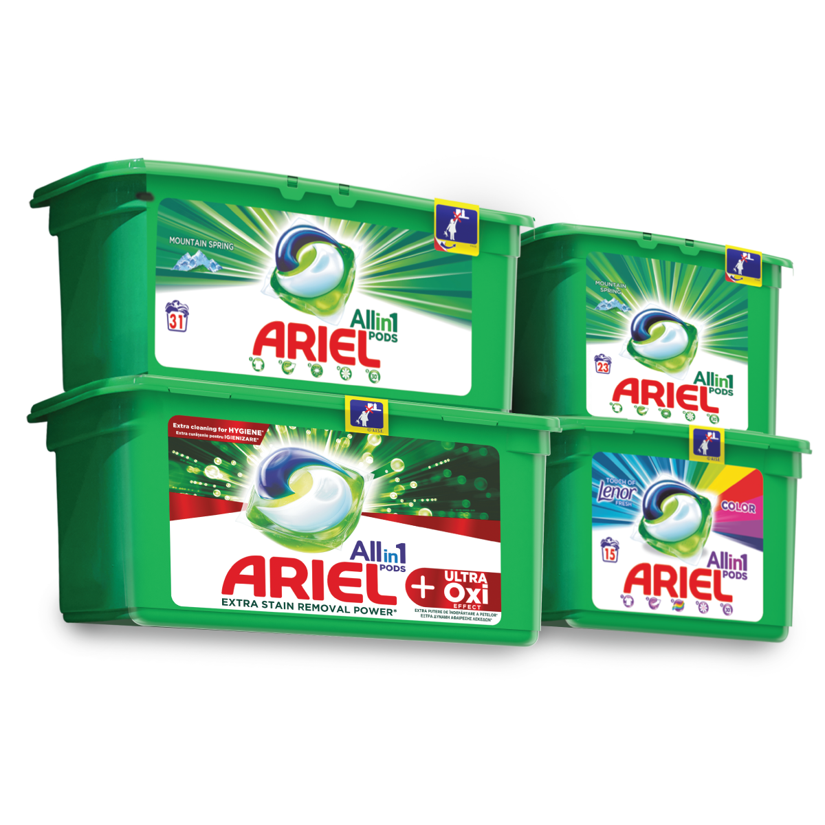 Paketimet Ariel PODS përmbledhin gjithçka që ju nevojitet për rroba të pastra, të ndritshme dhe me aromë të freskët në një kapsulë të vogël, por të fuqishme. Largoni njollat e dukshme të djersës, papastërti të pamundura e njollat kokëforta të ushqimit dhe përfitoni ndjesinë e rrobave jashtëzakonisht të pastra!