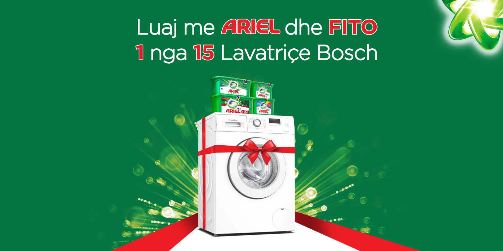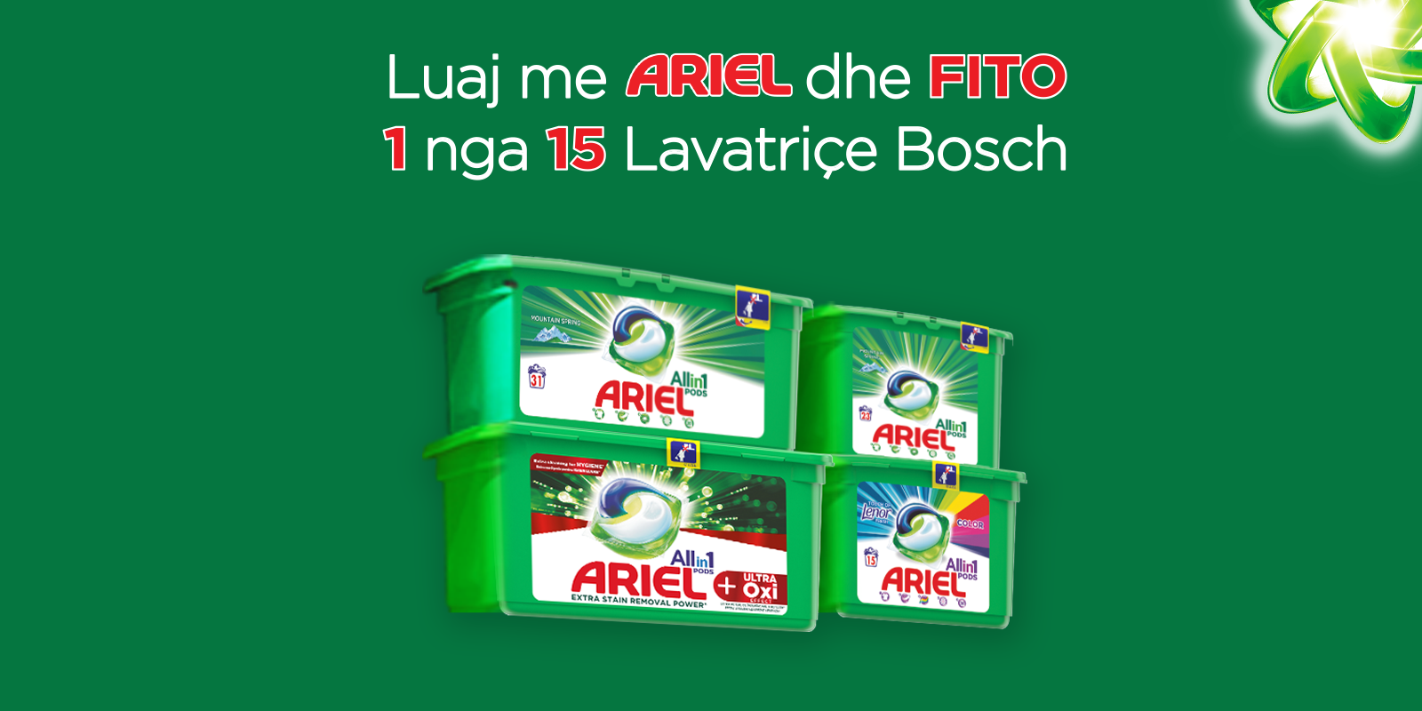 Bli produktet Ariel PODS në madhësinë 12, 13, 15, 23, 25 dhe 31 larje dhe regjistro kuponin tatimor online për të fituar 1 nga 15 lavatriçe Bosch.